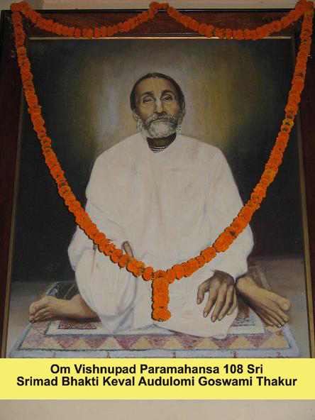 From childhood Audulomi was endowed with a calm and quiet temperament. He graduated with distinction from the Calcutta University in 1919, thereafter he studied philosophy in Varanasi for a few months and later was employed as a teacher. However, becoming interested in spiritual matters, he soon became disenchanted with his work and took shelter of Sri Bhakti Siddhanta Sarasvati Maharaj. At his initiation Prabhupada Sarasvati gave him the name Patita-pavana dasa brahmacari. During his brahmacari days he was engaged in temple services, such as caring for the deity. Some years later Bhaktisiddhanta Sarasvati initiated him into Tridanda sannyasa, giving him the name Bhakti Kevala Audulomi Maharaja. From that time he was engaged in preaching throughout India. He was one amongst the sannyasi and brahmacari disciples of Bhaktisiddhanta who was chosen to preach the message of Lord Cai tanya throughout the world. He was also fortunate enough to be blessed with the darshan of Bhaktivinoda Thakura, whereupon he became inspired to seriously take up the study of the sastras. In March 1940, Audulomi Maharaj was instructed by His Guru to undertake Navadvip-dhama parikrama. Thus for seven consecutive years, Audulomi Maharaja not only led the parikrama, but also acted as the head of the entire Navadvipa mandala and Sri Caitanya Matha. In 1943 he was selected as a member of the Gaudiya Mission Paricarya committee. He also took an active part in publishing and distributing devotional books. He translated Lord Chaitanya's Sikshashtak into English. Around this time the Acharya of Gaudiya Math, Sri Bhakti Prasada Puri gave a series of discourses on Bhakti Sandarbha at Mayapura, which Sri Audulomi attended and listened to with rapt attention. For some years, while observing Urjavrata, Audulomi Maharaja travelled and preached widely throughout Mymensingh, Naryanaganj, and Dhaka in East Bengal. After completing his vow in October 1953, and bathing in the Jamuna, he took up the garb of Paramahamsa. At the Kumbha Mela festival held in Prayaga
