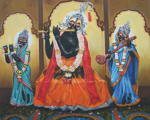 "In the Gaura-ganodesa-dipika, verses 147 through 153, it is stated: "The pleasure potency of Sri Krishna formely known as Vrindavaneshvari Srimati Radharani is now personified in the form of Sri Gadadhara Pandit in the pastimes of Lord Chaitanya Mahaprabhu. Sri Svarupa Damodara Goswami has pointed out that in the shape of Lakshmi, the pleasure potency of Krishna, she was formely very dear to the Lord as Shyamasundara-vallabha. The same Shyamasundara-vallabha is now present as Gadadhara Pandit". From his early childhood, Gadadhara was very serene, patient, calm, quiet, fond of solitude and very renounced. Nimai Pandit during the time of His precocious youth would ask his fellow students meaningless, fallacious questions in logic. Gadadhara however, was not especially fond of this pastime, and therefore he sometimes used to maintain some distance from Nimai. On the way to their school, Nimai would catch hold of Gadadhar and chide him, “What do you think of yourself – you think you are a really great pandit? Tell me, what are the symptoms of a liberated soul?” Gadadhar would give his explanation based on the scriptures. Nimai would then tell him that it was the absolutely wrong answer. “The display of acute misery and suffering is actually the symptom of a truly liberated soul” said Nimai. Gadadhar tried to argue further on the point. With a wave of his hand, Nimai dismissed all his logic and told him that he (Gadadhar) would understand the answer later on when he got home. Gadadhar wondered why Advaita Acharya looked up to Nimai with such intense faith and devotion. Even Ishwar Puri seemed respectful of him. While there was no doubt that Nimai Pandit was exceedingly clever and intelligent, it seemed that Advaita Acharya glimpsed something beyond the mere intellectual prowess of the young man and beheld something at another level, which he could not understand or reach to. Once while Gadadhar was plucking flowers at the home of Srivas Pandit, Srivas came up to Gadadhar with a basket for the flowers, beaming with joy. Gadadhar asked “What makes you so happy?” Srivas replied, “Nimai has returned from Gaya just yesterday. It is unbelievable that the cheeky and arrogant boy has changed so completely. He has turned into a compassionate, humble and meek person. Continuously shedding tears, he writhes in agony and cries pitieously, ‘Krishna, Krishna…’ He does not even look like a normal human being anymore – rather like someone from another realm.” Srivas Pandit continued, “Our desire seems to be on the verge of fulfilment. He has called up to congregate at the house of Shuklambar Brahmachari. Perhaps he will share the reasons of his pain and suffering with us.” Gadadhar instinctively exclaimed, “Even though I am not invited, I will also go. I also want to know the reason behind the incredible change in Nimai.” So he went but hid himself from the rest, as he was not invited to the secret congregation scheduled to take place in Shuklambar’s courtyard. The beautiful, golden and effulgent Nimai stood in the middle of the courtyard, and passed his large lotus eyes over the gathering before Him. Losing control of Himself, he burst into tears and sobbed loudly, crying “Where is my Lord Sri Krishna? He was here just now, where has he disappeared, where has he hidden himself from me? The heart wrenching sincerity and desperation of His cry stunned everyone present. Nimai then fell down unconscious with a great crash. When he regained consciousness, He could hear someone sobbing very loudly. The sound seemed to be coming from inside the house. He went into the house and asked who was it that was crying so pathetically. Shuklambar told him, “It is your Gadadhar.” From his very childhood, Gadadhar had followed behind Nimai as if he were his shadow. Gadadhar was quite detached from the world, his only object of attachment was Nimai. Nimai called Gadadhar and told him, “My dear Gadadhar, since your early childhood, you have always been devoted to Lord Krishna. But I have simply wasted my time in false pursuits and achieved nothing. At one time I too was close to Sri Krishna, but due to my own fault I have now lost this invaluable treasure. Please tell me, how can I find him again?” He wept inconsolably and lost consciousness again. After some time, seeing Gadadhar alone, Nimai asked him again, “Where is my Lord Krishna? Please tell me.” Gadadhar answered, “Your Krishna is hidden within your heart.” At this, Nimai started digging into his chest with his nails. Gadadhar leapt forward and held Nimai’s hands tightly. Mother Sachi happened to witness this incident and ran up to them and told Gadadhar, “You have just saved my Nimai.” She blessed him and said, “Stay with Nimai for your entire life so that my son may be protected.” Sri Gadadhara Pandita was very affectionate towards Mukunda datta. Whenever any Vaisnava saint came to Navadwip, Mukunda would inform Gadadhara and they would both go to have darsana. One time Pundarika Vidyanidhi came from Chattagram to Navadwipa and Mukunda invited Gadadhara to come along and meet him. Gadadhara was very excited to meet a exalted Vaisnava and the two of them happily set out together to have darshan of the famous Pundarika Vidyanidhi. However, Gadadhara was not prepared for the sight that met his eyes. He saw that Pundarika Vidyanidhi was dressed in fine silk, his lips red with the juice of betel-leaf and was reclining on a fine couch resting against velvet cushions. His servants were fanning him and spraying scented oil all around the room. Gadadhar Pandit was not impressed. How could this apparently sensual person be called a ‘great Vaishnava’ he wondered. He was disappointed and wanted to leave immediately. However, Mukunda knew the real character of Pundarika Vidyanidhi, and he could also sense the doubts in the mind of Gadadhara Pandita. Thus he recited some slokas from the Srimad Bhagavatam in a ver