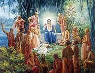 Sitting on a rock under a tree on the bank of the Ganges, Lord Nityananda looked as effulgent as the rising sun. Many devotees sat on the ground surrounding Him simply gazing at his face. Raghunatha das offered his obeisances by falling prostrate from a distance, as he considered himself too low to go anywhere near Nityananda Prabhu. One of the servants of Nityananda Prabhu pointed out, "There is Raghunatha das, offering You obeisances."